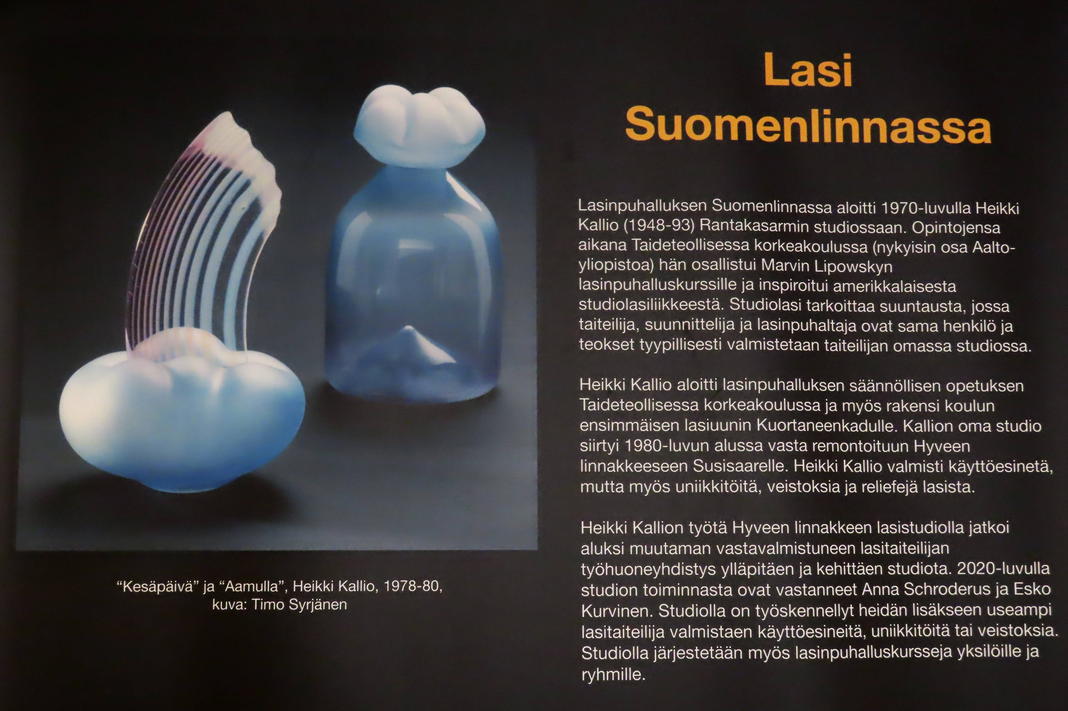 Suomenlinnassa on puhallettu lasia jo 1970-luvulla. Heikki Kallion aloittamaa studiolasitoimintaa on jatkanut Lasistudio Hytti, jossa on työskennellyt useita käyttö- ja taidelasin tekijöitä. Kiertonäyttelyä on täydennetty Heikki Kallion ja Suomenlinnassa 2020-luvulla toimineiden lasitaiteilijoiden teoksilla.