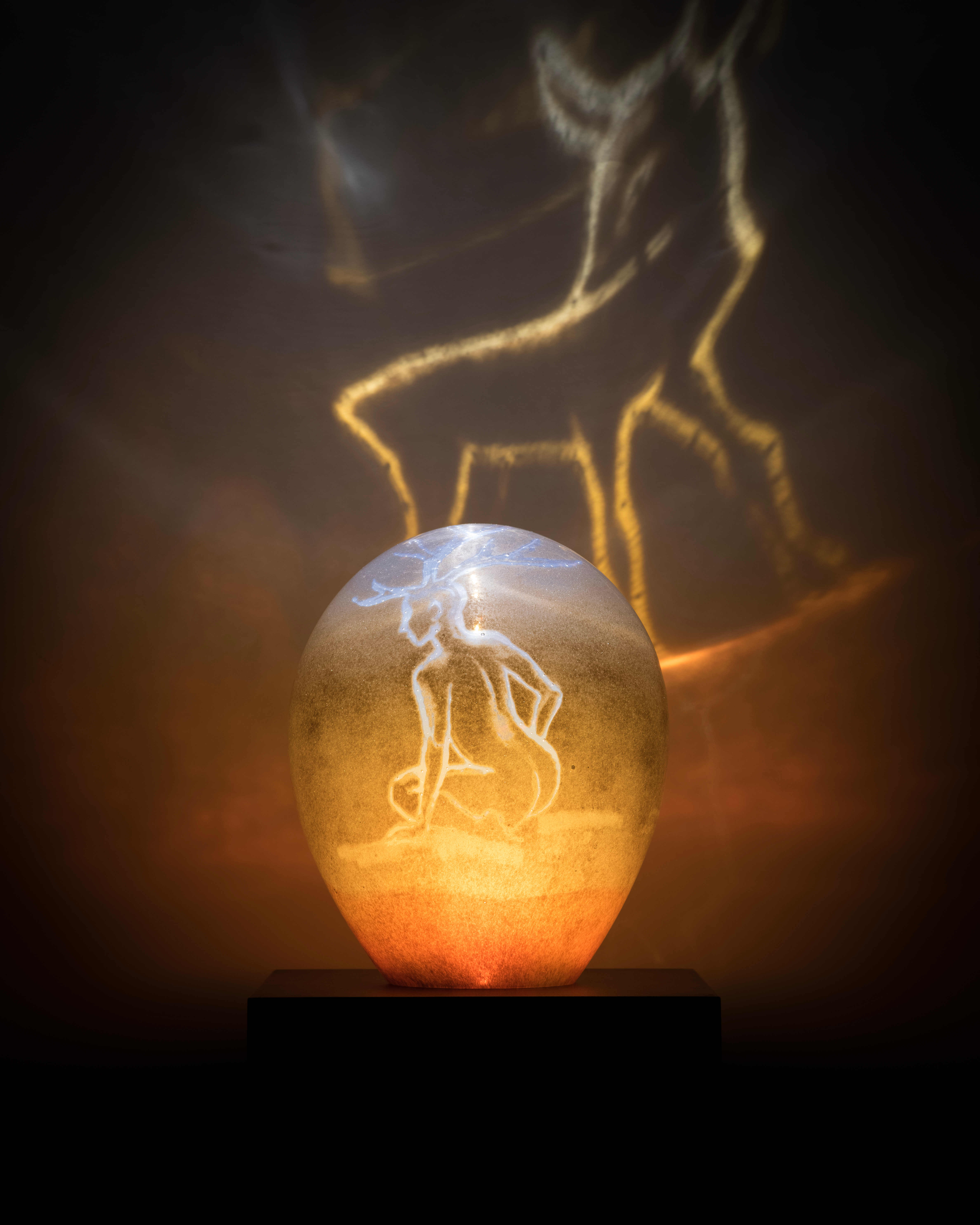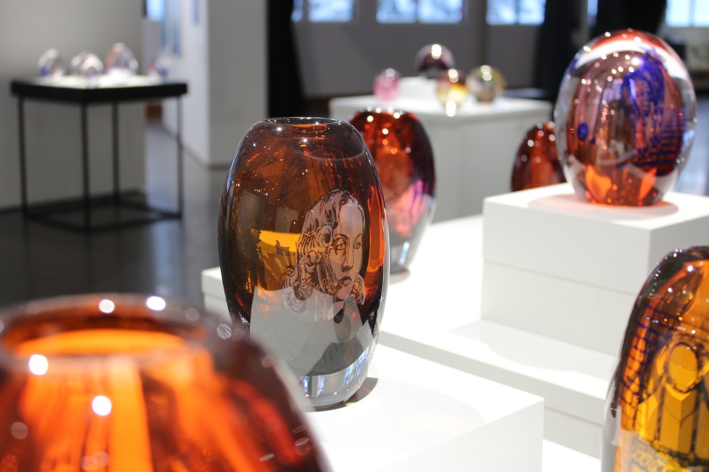 Colours of the Afterlife brings Ella Varvio’s glass art to Galleria Himmelblau. The artworks are inspired by colours and subjects of ancient Chinese ceramics. Varvio’s imagery is often narrative and her art pieces are made using traditional craft techniques such as glassblowing and engraving. Moreover the exhibition has a link to new glass research as there is a section about colour research conducted together with Tampere University Photonics Laboratory. Photonics is the science of light and it studies glass as a material that transmits light. In the multidisciplinary PhotonArt project colours of old Chinese glazes were analyzed to create new glass materials.